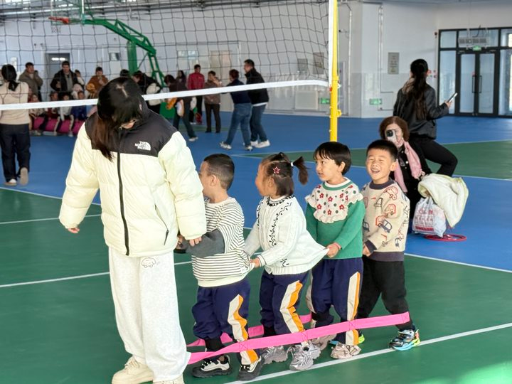 研学活动尾声,孩子们前往室内体育馆,在学院师生的协助下,与家长共同参与趣味亲子运动会。“毛毛虫竞速”项目趣味十足,家长与孩子协力操控充气“毛毛虫”奋勇前行,现场呐喊声、欢笑声交织;经典游戏“绑腿跑”更将活动气氛推向高潮,孩子们相互角逐,纯真笑脸感染了在场每一个人。